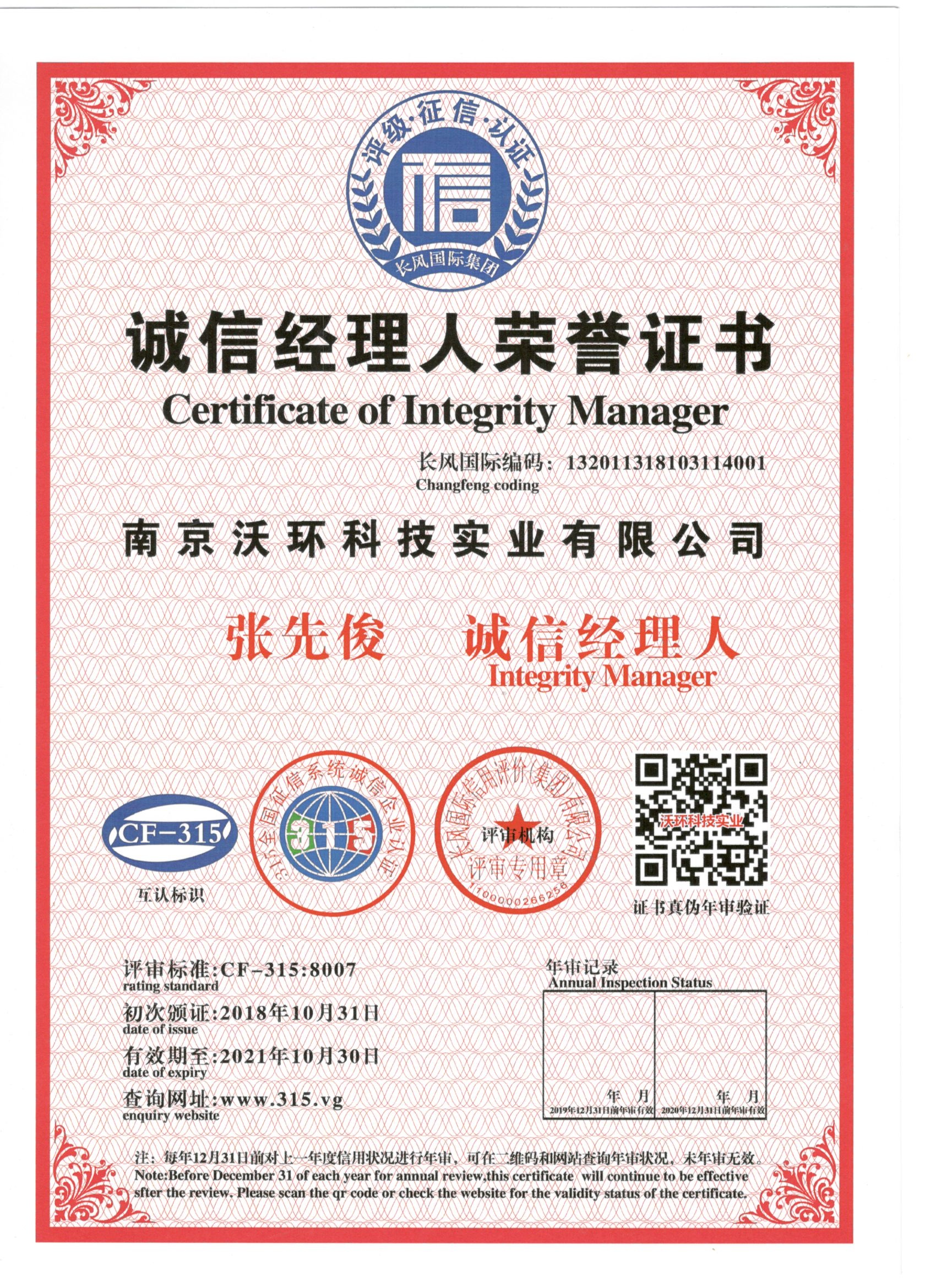 熱烈祝賀南京沃環(huán)公司張先俊先生榮獲誠(chéng)信經(jīng)理人證書(shū) |