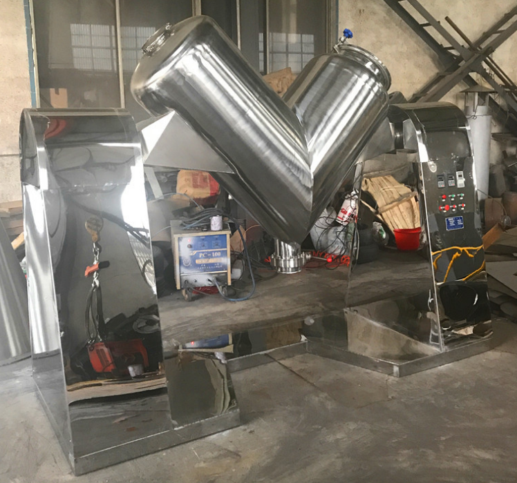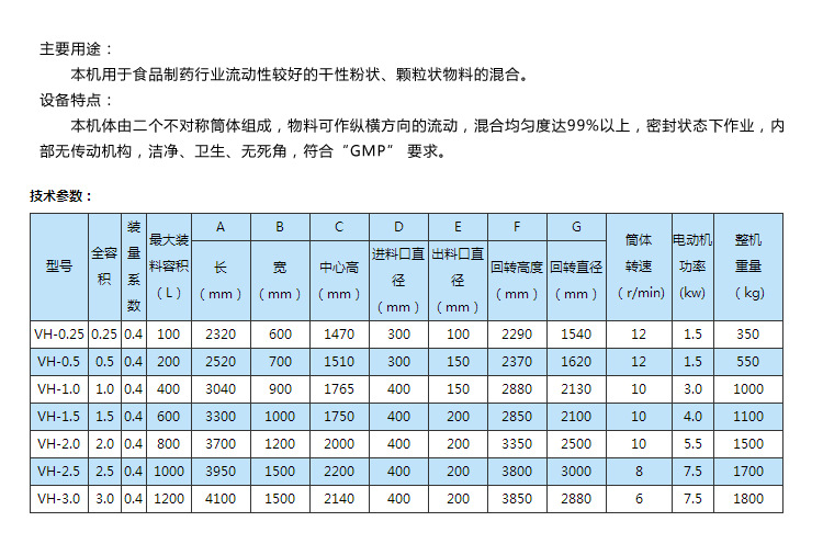產(chǎn)品概述: 本機(jī)適用于制藥、化工、食品的干粉狀、顆粒裝物料的混合。該機(jī)混料筒結(jié)構(gòu)獨(dú)特,混合均勻,效率高,不積料。整機(jī)結(jié)構(gòu)簡(jiǎn)單,操作容易。外表面和物料接觸部分均采用優(yōu)質(zhì)不銹鋼制造,造型美觀,維護(hù)、清洗方便。 應(yīng)用場(chǎng)景: 本機(jī)用于制藥及其它行業(yè)的粉狀或粒狀物料混合之用。本系列混合機(jī)有高效混合型和普通混合型兩種,高效型混合機(jī)主要對(duì)較細(xì)的粉;?qū)δ骋恢髁虾枯^少的物料均能混合均勻;普通型混合機(jī)主要適用于一般物料或產(chǎn)量較大的企業(yè)使用。筒體光滑無(wú)死角、整機(jī)采用不銹鋼材料制作、且外型美觀等特點(diǎn)。 工作原理: 本機(jī)一端裝有電機(jī)與減速機(jī),電機(jī)功率通過(guò)皮帶傳給減速機(jī),減速機(jī)再通過(guò)聯(lián)國(guó)器傳給V型桶。使V型桶連續(xù)運(yùn)轉(zhuǎn),帶動(dòng)桶內(nèi)物料在桶內(nèi)上、下、左、右進(jìn)行混合。 材質(zhì)及結(jié)構(gòu): 1、 混合機(jī)的筒體采用2.5mm304-2B不銹鋼材料制作,外包采用1.2mm304-2B的不銹鋼材料制作,支架采用5#槽鋼。 2、混合的出料閥選用全不銹鋼精加工而成,并在連接處采用定型硅橡膠材料密封,確保機(jī)器在工作時(shí)的密封效果。 3、混合機(jī)的進(jìn)料口采用選進(jìn)的快開(kāi)結(jié)構(gòu),使用戶在進(jìn)料和清洗時(shí)操作簡(jiǎn)便。 4、混合機(jī)筒體兩側(cè)拼縫處加焊兩塊不銹鋼引板并采用拋光處理,使筒體內(nèi)無(wú)一處死角,確;旌蠙C(jī)在混合、清洗時(shí)能夠達(dá)到理想的效果。 5、混合機(jī)內(nèi)設(shè)有強(qiáng)制攪拌裝置。